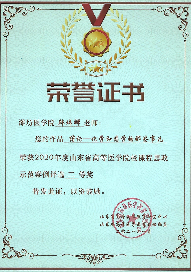 韩玮娜副教授的“绪论—化学和药学的那些事儿”荣获“2020年度山东省高等医学院校课程思政示范案例”二等奖。案例在《无机化学》绪论中融入了多种思政元素。比如以老一辈科学家在艰苦条件下进行科研工作的故事,传播奋斗精神;以学科案例,诠释辩证思维,辩证地看待化学这把“双刃剑”。