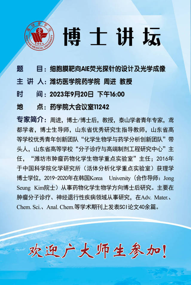 周进,博士/博士后,教授,泰山学者青年专家,鸢都学者,博士生导师,山东省优秀研究生指导教师,山东省高等学校优秀青年创新团队“化学生物学与药学分析创新团队”带头人,山东省高等学校“分子诊疗与高端制剂工程研究中心”主任,“潍坊市肿瘤药物化学生物学重点实验室”主任;2016年于中国科学院化学研究所(活体分析化学重点实验室)获理学博士学位,2019-2020年在韩国Korea University(合作导师:Jong Seung Kim院士)从事药物化学生物学方向博士后研究。主要在肿瘤分子诊疗、神经退行性疾病领域从事研究,在Adv. Mater.、Chem. Sci.、Anal. Chem.等学术期刊上发表SCI论文40余篇。