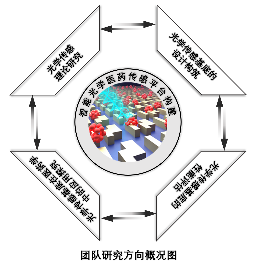 开展生物标志物及手性医药中间体的高效检测方法研究对诊断医学和新药研发有着重要意义。山东第二医科大学作为省内重要的医药学研究中心,汇聚了包括医学、药学、化学及材料学等不同学科背景的优秀青年博士,有着天然的交叉合作优势。特别地,以团队带头人为代表的团队成员前期在传感原理、纳微结构设计与制备及医药分子信号处理等前沿领域积累了成熟的技术与丰富的经验,各成员之间优势互补,已具备合作开展上述高效医/药传感方法研究的条件。在此背景下,本团队围绕“智能光学医药传感平台构建”这一方向,依托山东第二医科大学国家一流专业药学,及创新药物研发中心和医学研究中心,以应用需求为切入点,关注特征生物及手性医药中间体的高效检测,以构建高性能生物医药传感平台为目标,充分发挥团队人员前期获得的相关领域研究基础(近五年SCI中科院一区论文超过30篇),通过多学科交叉手段,系统开展智能光学传感平台构建及其生物医药应用研究。团队采取分工明确、密切沟通和优势互补的合作方式,各成员间共享实验室、实验试剂和学术资源,在科研、教学、学科建设和人才培养中相互合作,相互支持。团队研究方向概况如下图所示。