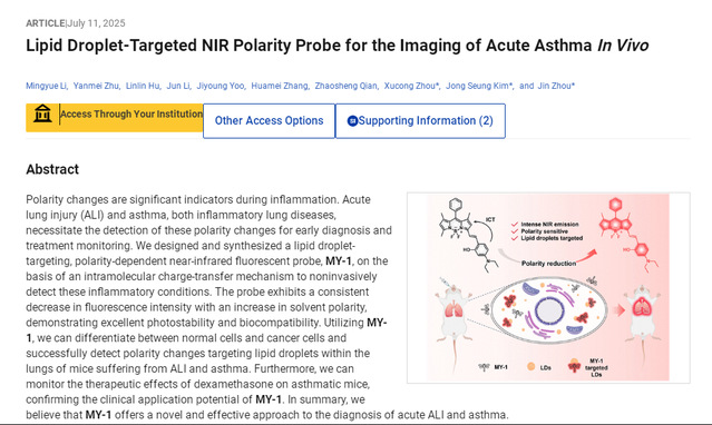 第一篇研究论文Lipid Droplet-Targeted NIR Polarity Probe for the Imaging of Acute Asthma In Vivo(Anal. Chem. 2025, 68, 15165),基于分子内电荷转移机制,设计合成了一种靶向脂滴的极性依赖性近红外荧光探针MY-1,用于无创检测炎症状态。该探针的荧光强度随溶剂极性升高而显著降低(降幅达65倍),并具备优异的光稳定性和生物相容性。利用MY-1,作者成功区分了正常细胞与癌细胞,并在急性肺损伤和哮喘小鼠肺部实现了脂滴极性变化的活体检测。此外,该探针可监测地塞米松对哮喘小鼠的治疗效果,证实了其临床应用潜力,为急性肺损伤和哮喘的诊断提供了新型有效策略。