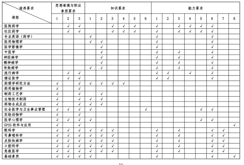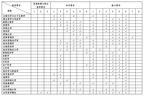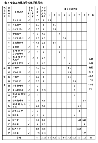 (二)核心课程:无机化学、有机化学、分析化学、物理化学、生物化学与分子生物学、系统解剖学、生理学、病理学、病理生理学、微生物与免疫学、药物化学、药剂学、药物分析学、生物药剂学、诊断学、内科学、外科学、妇产科学、儿科学、药理学、药物毒理学、临床药理学、临床药物治疗学、临床药物动力学、医学伦理学、药事管理学。
